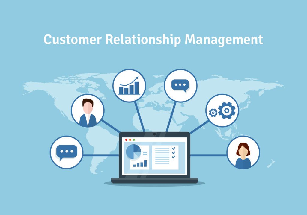 CRM concept design with vector elements. Flat icons of accounting system, clients, support, deal. Organization of data on work with clients, Customer Relationship Management.